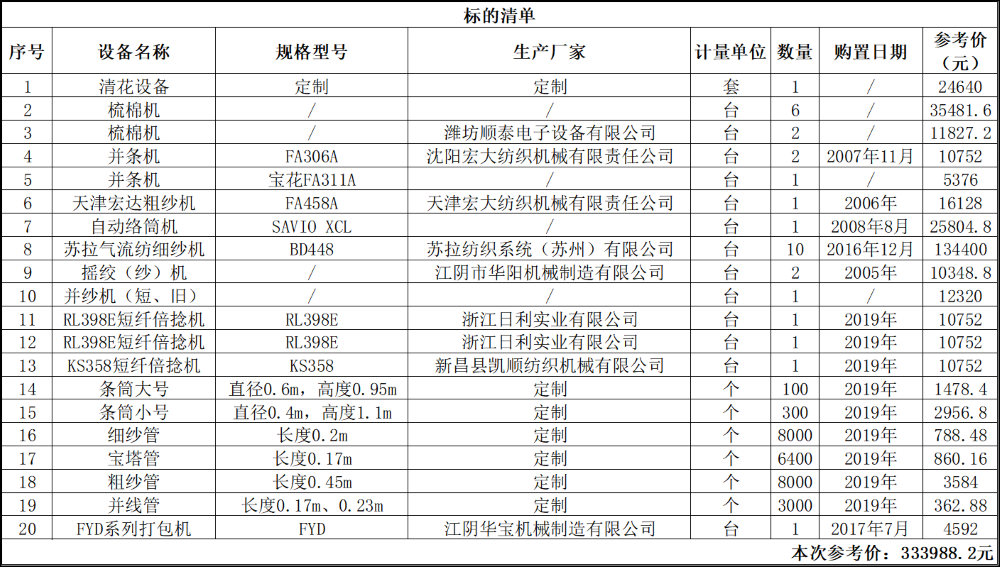 一、拍賣標(biāo)的:二手紡織設(shè)備一批,包括清花設(shè)備、自動(dòng)絡(luò)筒機(jī)、梳棉機(jī)、并條機(jī)、粗紗機(jī)、細(xì)紗機(jī)等。以上標(biāo)的整體拍賣,參考價(jià):333988.2元。現(xiàn)狀拍賣,現(xiàn)狀移交。競(jìng)買保證金:5萬(wàn)元。