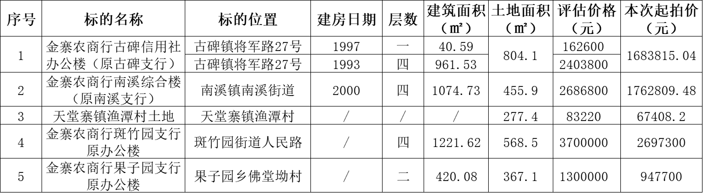 金寨農(nóng)商行閑置房地產(chǎn):古碑信用社辦公樓(原古碑支行)、南溪綜合樓(原南溪支行)、天堂寨鎮(zhèn)漁潭村土地、斑竹園支行原辦公樓、果子園支行原辦公樓等五處資產(chǎn),F(xiàn)狀拍賣(mài),現(xiàn)狀移交。標(biāo)的詳情見(jiàn)下方所附清單:
