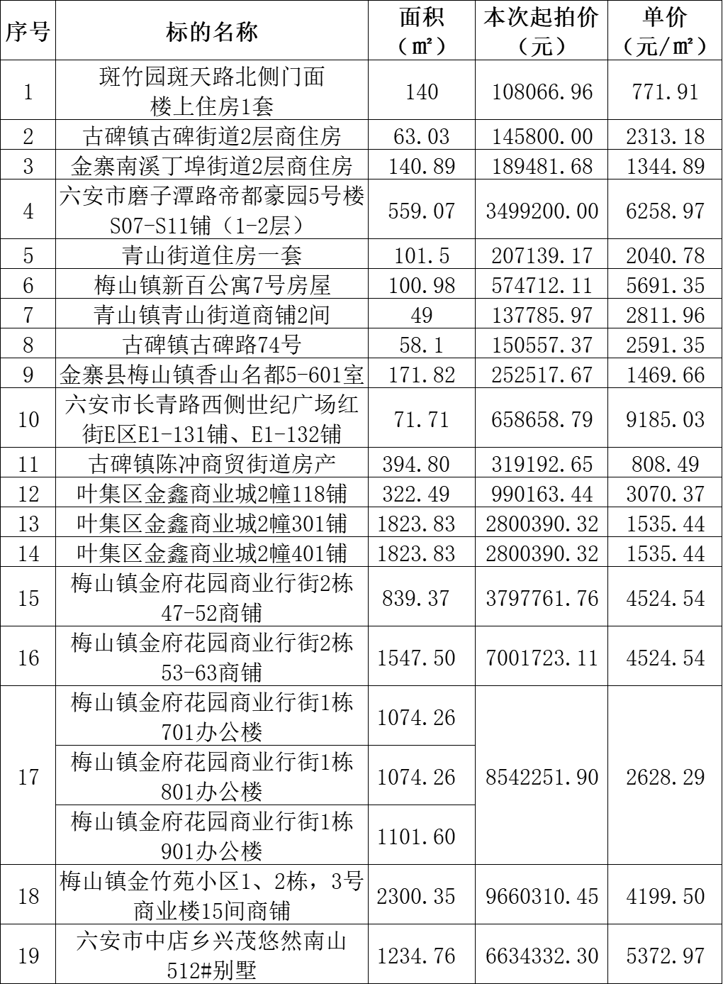 六安市磨子潭路帝都豪園商鋪、古碑鎮(zhèn)古碑街道商住房、葉集區(qū)金鑫商業(yè)城商鋪、梅山鎮(zhèn)金府花園商業(yè)行街辦公樓、六安興茂悠然南山別墅等19處房產(chǎn),最低單價(jià)771.91元/㎡。標(biāo)的詳情見(jiàn)下方所附清單: