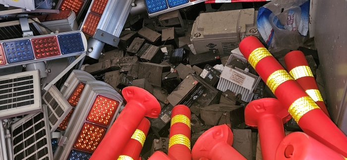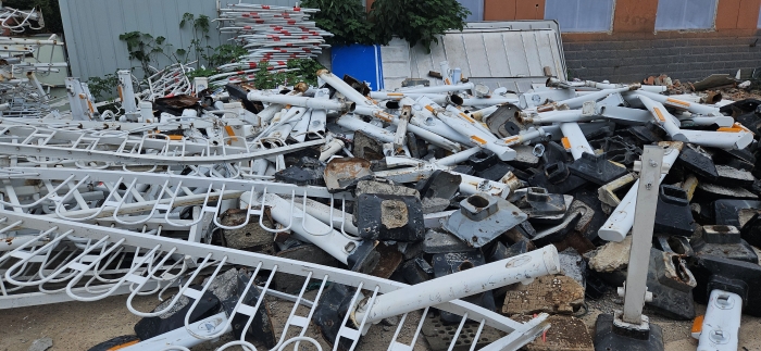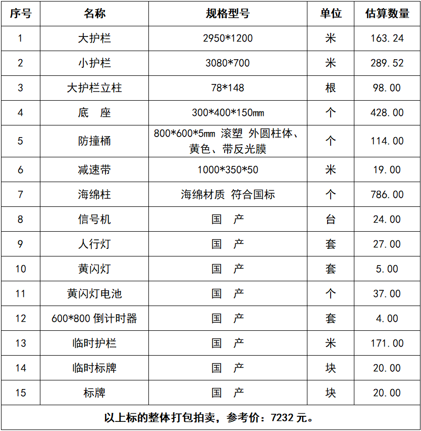 一、拍賣標(biāo)的:廢舊物資一批,包括護(hù)欄、防撞桶、黃閃燈電池等,參考價:7232元。