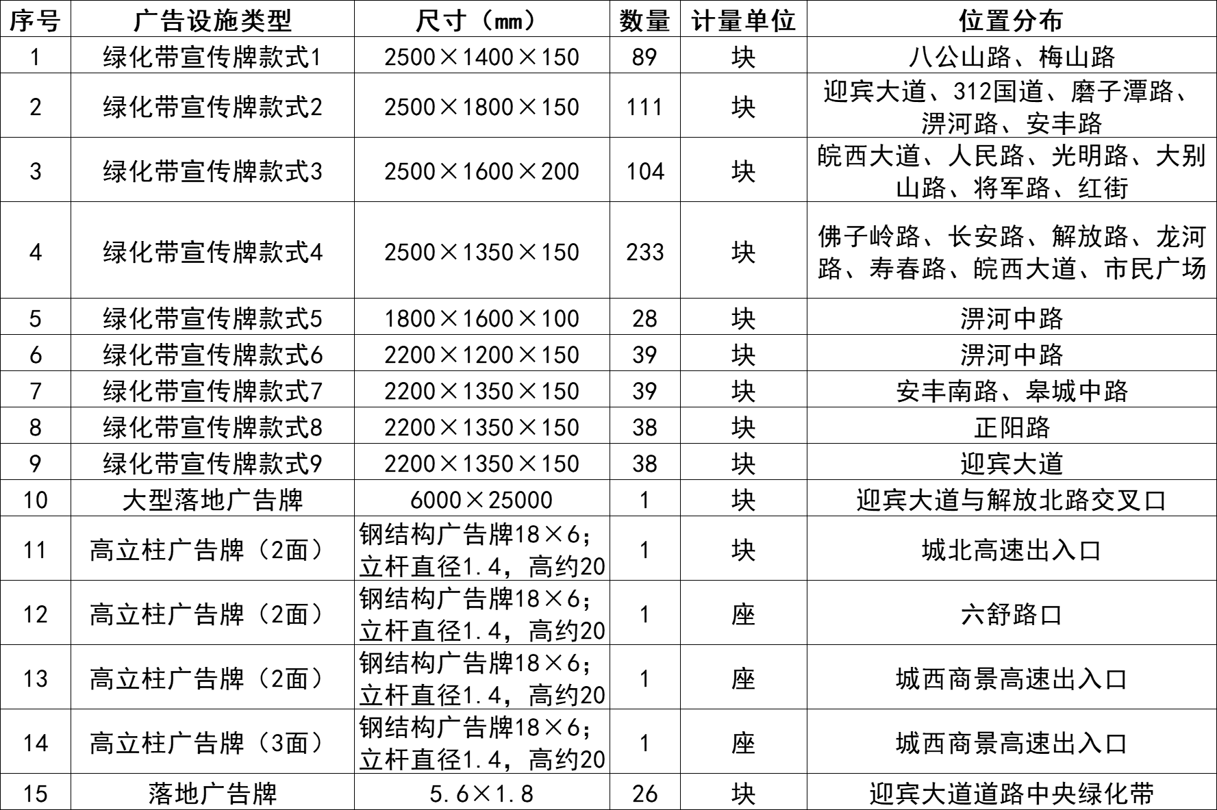 六安城區(qū)750塊戶外廣告牌5年期經營權,包括:綠化帶廣告牌719塊、大型落地廣告牌1塊、高立柱廣告牌4塊、落地廣告牌26塊。以上標的整體按5年期經營權總價拍賣,5年期總參考價:277.78萬元,競買保證金:20萬元。
