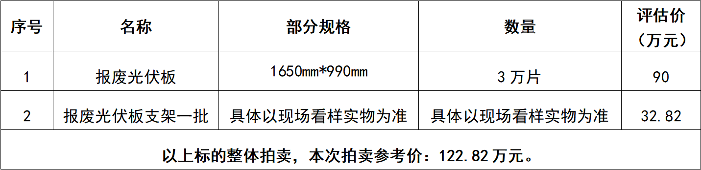 一、拍賣標(biāo)的:報廢光伏板3萬片及報廢光伏板支架一批(具體以現(xiàn)場看樣實物為準(zhǔn)),整體拍賣,參考價:122.82萬元。競買保證金:15萬元。