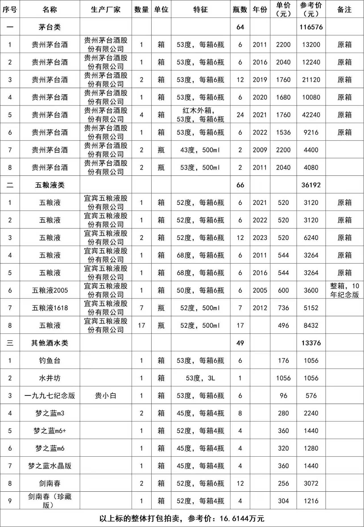 1、貴州茅臺(tái)酒計(jì)64瓶、五糧液酒計(jì)66瓶及其他類酒水計(jì)49瓶,整體打包拍賣,參考價(jià):16.6144萬(wàn)元,競(jìng)買保證金:2萬(wàn)元。標(biāo)的詳情見(jiàn)下方清單:
