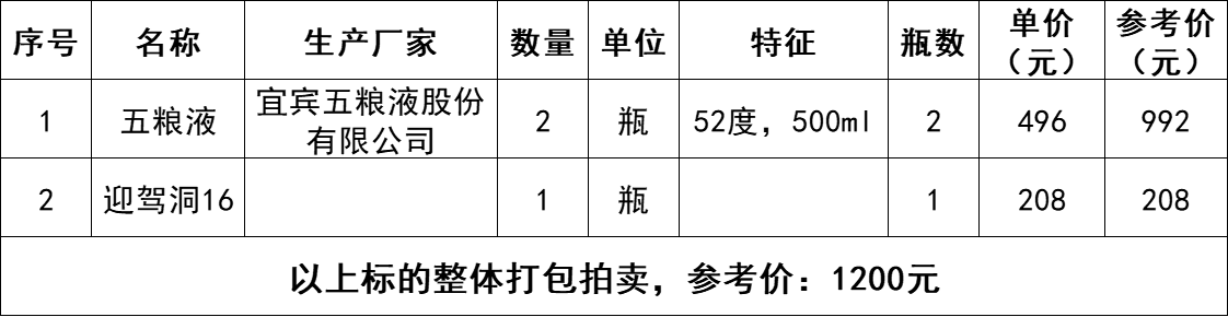 2、五糧液酒2瓶、迎駕洞藏16酒1瓶,整體打包拍賣,參考價(jià):1200元,競(jìng)買保證金:1000元。標(biāo)的詳情見(jiàn)下方清單: