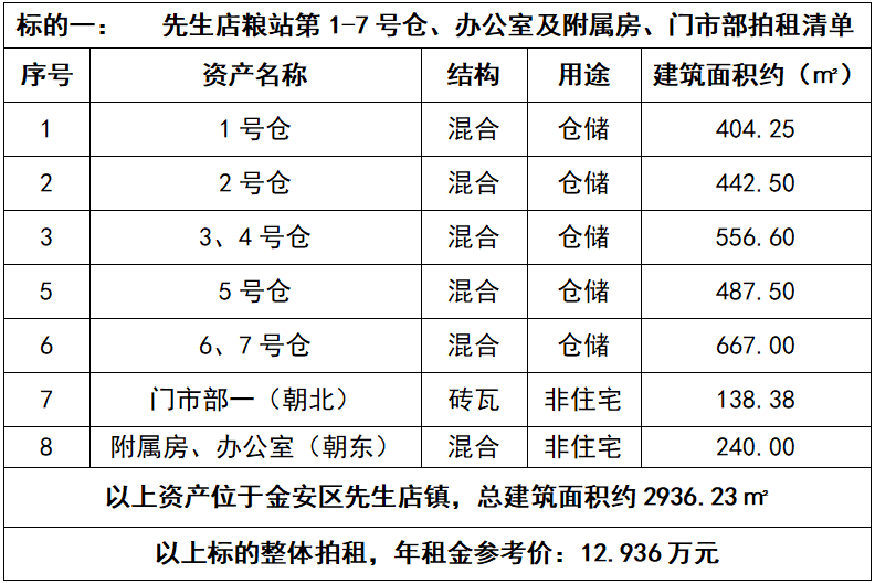 1、先生店糧站第1-7號(hào)倉(cāng)、辦公室及附屬房、門(mén)市部3年期租賃經(jīng)營(yíng)權(quán),整體拍租,總建筑面積約2936.23㎡,年租金參考價(jià):12.936萬(wàn)元,競(jìng)租保證金:2萬(wàn)元。標(biāo)的詳情見(jiàn)下表: