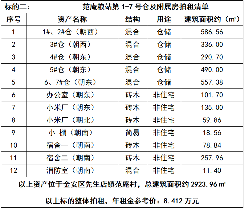 2、范庵糧站第1-7號(hào)倉(cāng)及附屬房3年期租賃經(jīng)營(yíng)權(quán),整體拍租,總建筑面積約2923.96㎡,年租金參考價(jià):8.412萬(wàn)元,競(jìng)租保證金:1萬(wàn)元。標(biāo)的詳情見(jiàn)下表: