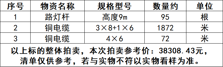 一、拍賣標(biāo)的:廢舊物資一批,包括道路燈桿、銅電纜等,參考價:38308.43元。競買保證金:1萬元。