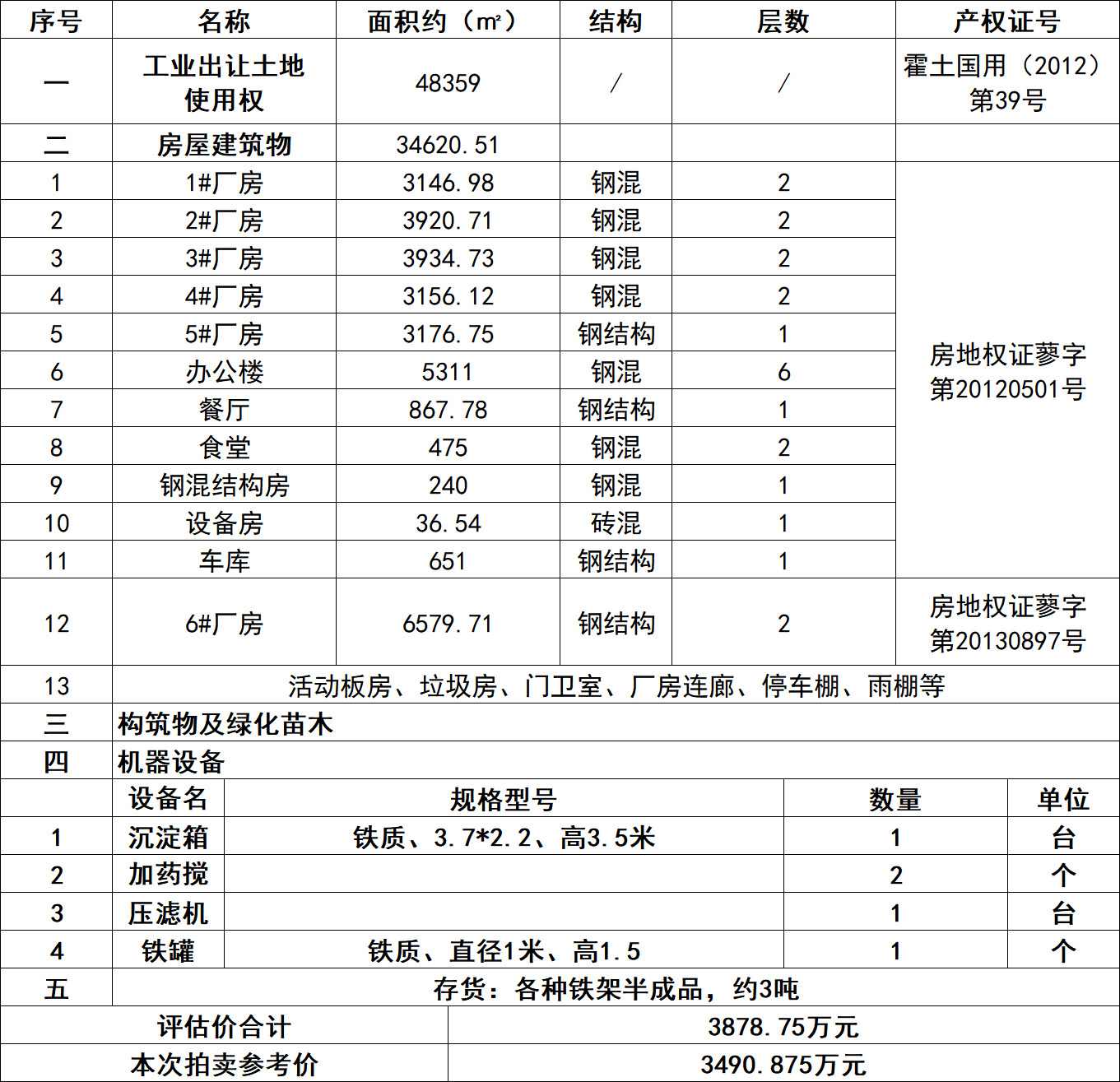 1、安徽華安達(dá)集團(tuán)工藝品有限公司位于霍邱城北工業(yè)園的工業(yè)房地產(chǎn)、構(gòu)筑物、綠化苗木、機(jī)器設(shè)備及存貨等,包括: