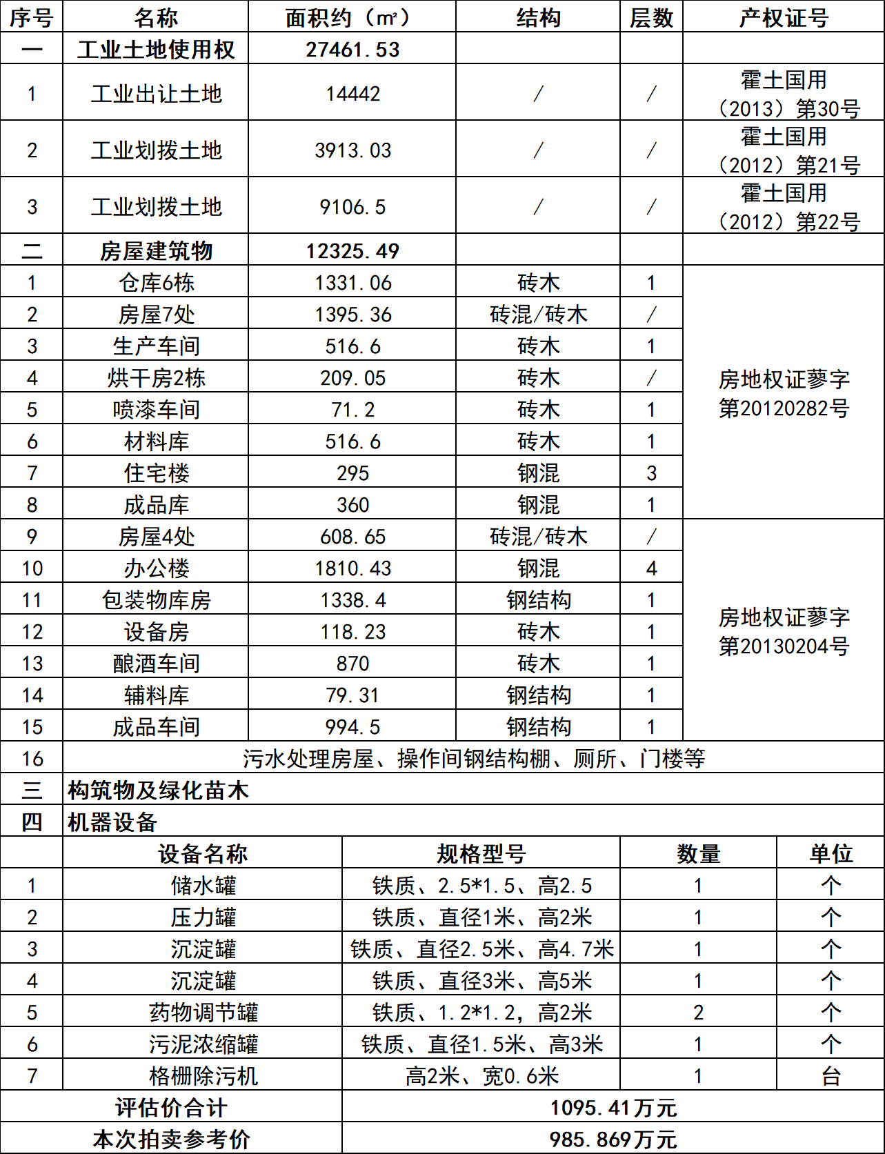 (2)房屋建筑物:倉庫、生產(chǎn)車間、烘干房、辦公樓、住宅樓等,總面積約12325.49㎡;